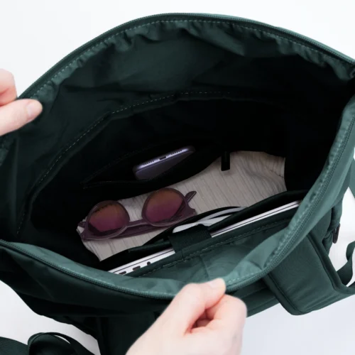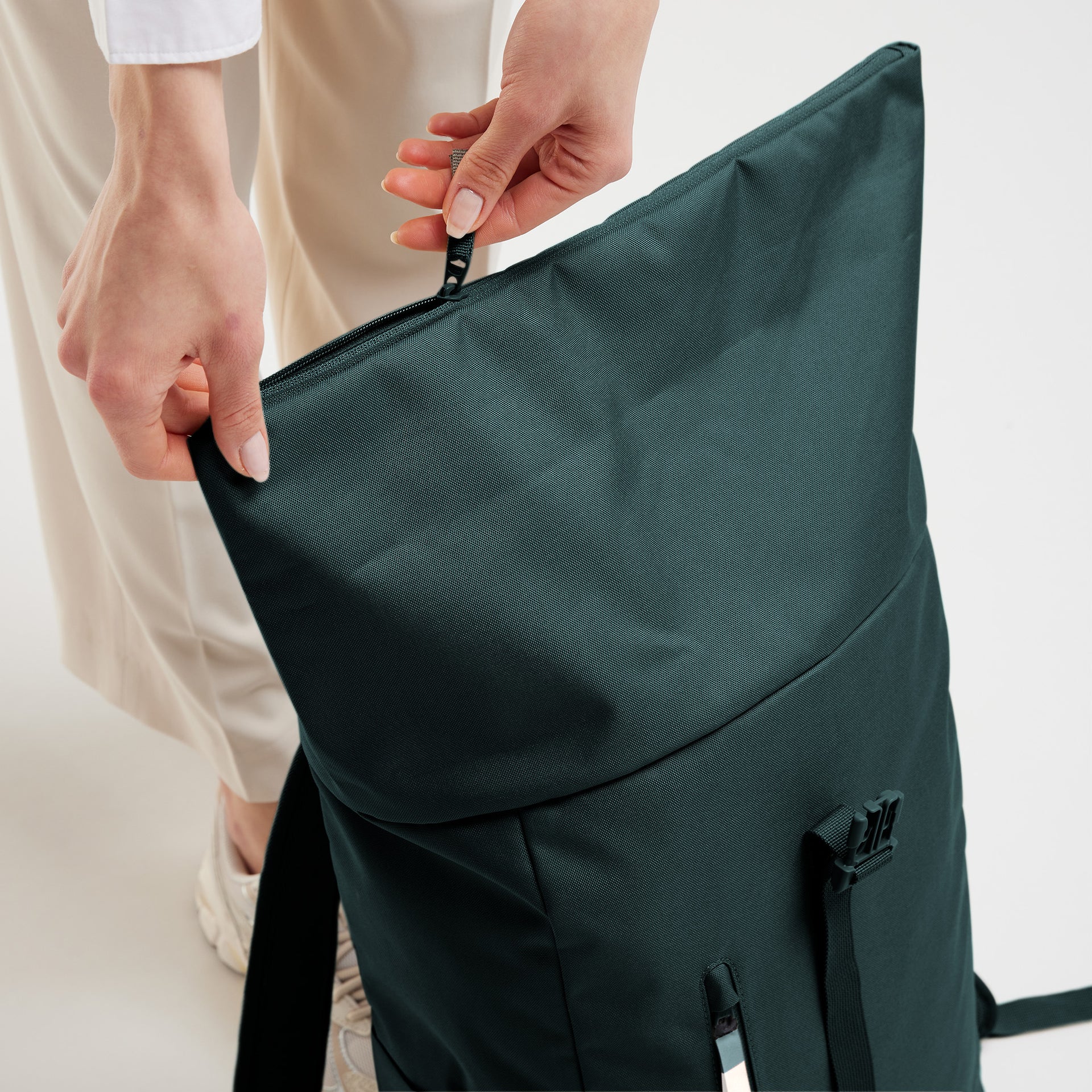 Effortlessly easy: The lightweight version of the classic, made from soft, water-repellent material with a zippered roll-top and outer bottle pockets.