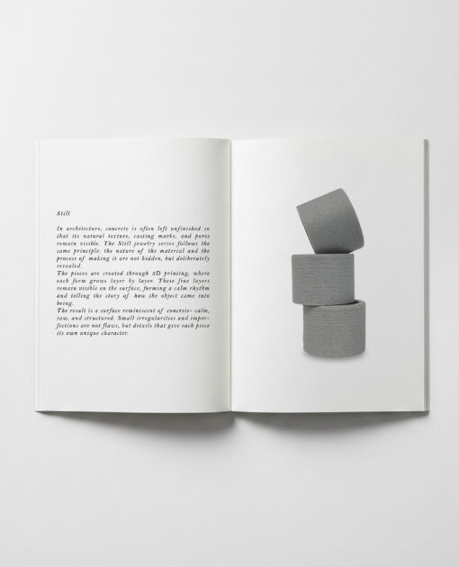 In architecture, concrete is often left unfinished so that its natural texture, casting marks, and pores remain visible. The STILL jewelry series follows the same principle: the nature of the material and the process of making it are not hidden, but deliberately revealed.
