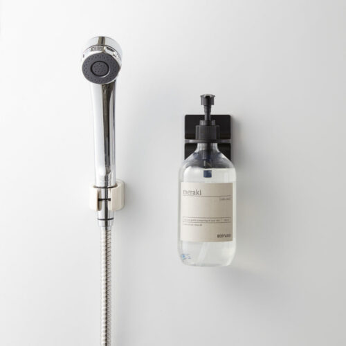 This holder mounts easily to the wall with the included self-adhesive Film Hook, offering a strong, secure hold. It neatly supports a soap dispenser and helps maintain a clean, organized area around the sink.