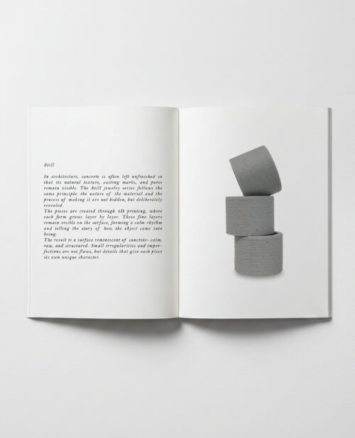 Arhitektuuris jäetakse betoon sageli viimistlemata, et nähtavale jääksid selle loomulik tekstuur, valujäljed ja poorid. Sama põhimõte on aluseks ka STILL sarja ehetele, kus materjali olemust ja valmistusprotsessi ei varjata, vaid tuuakse esile.