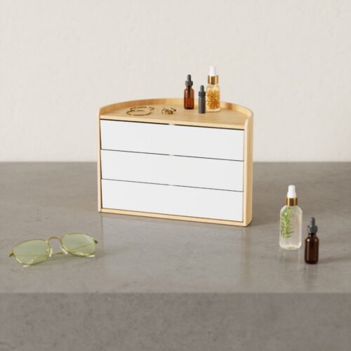 Moona on ümarate vormidega ainulaadne laegas, mis on nii dekoratiivne kui ka praktiline. Suur pealmine pind toimib alusena väiksematele aksessuaaridele, parfüümile, taimedele või muudele esemetele. Kolm pööratavat sahtlit pakuvad peidetud hoiuruumi ning neid saab hõlpsalt välja pöörata, et ehted oleksid kergesti ligipääsetavad. Moona poolringikujuline vorm ja puidust detailid sobivad hästi tualettlauale, letile või kummutile.